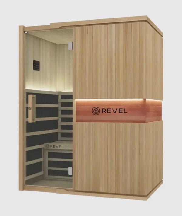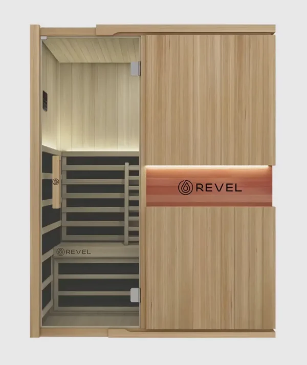 The Revel Aura features Western Red Cedar wood, which offers natural durability and moisture resistance ideal for sauna environments. Cedar also emits a pleasant aroma that enhances the overall wellness experience.